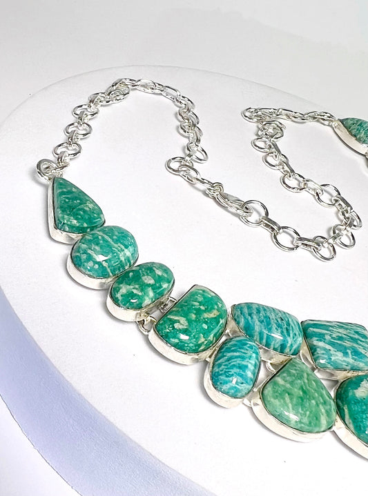 Diese beeindruckende Halskette besticht durch eine farbenfrohe Kombination von Edelsteinen, darunter Amethyst,...