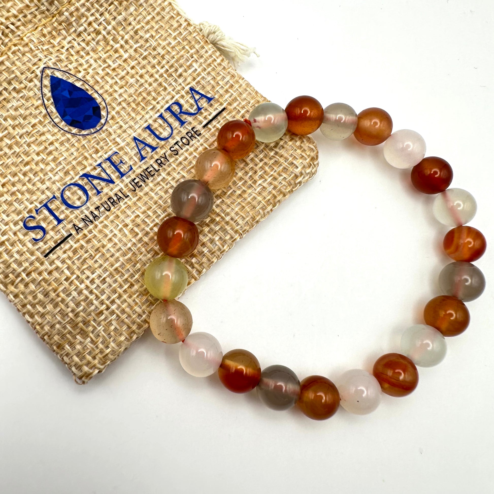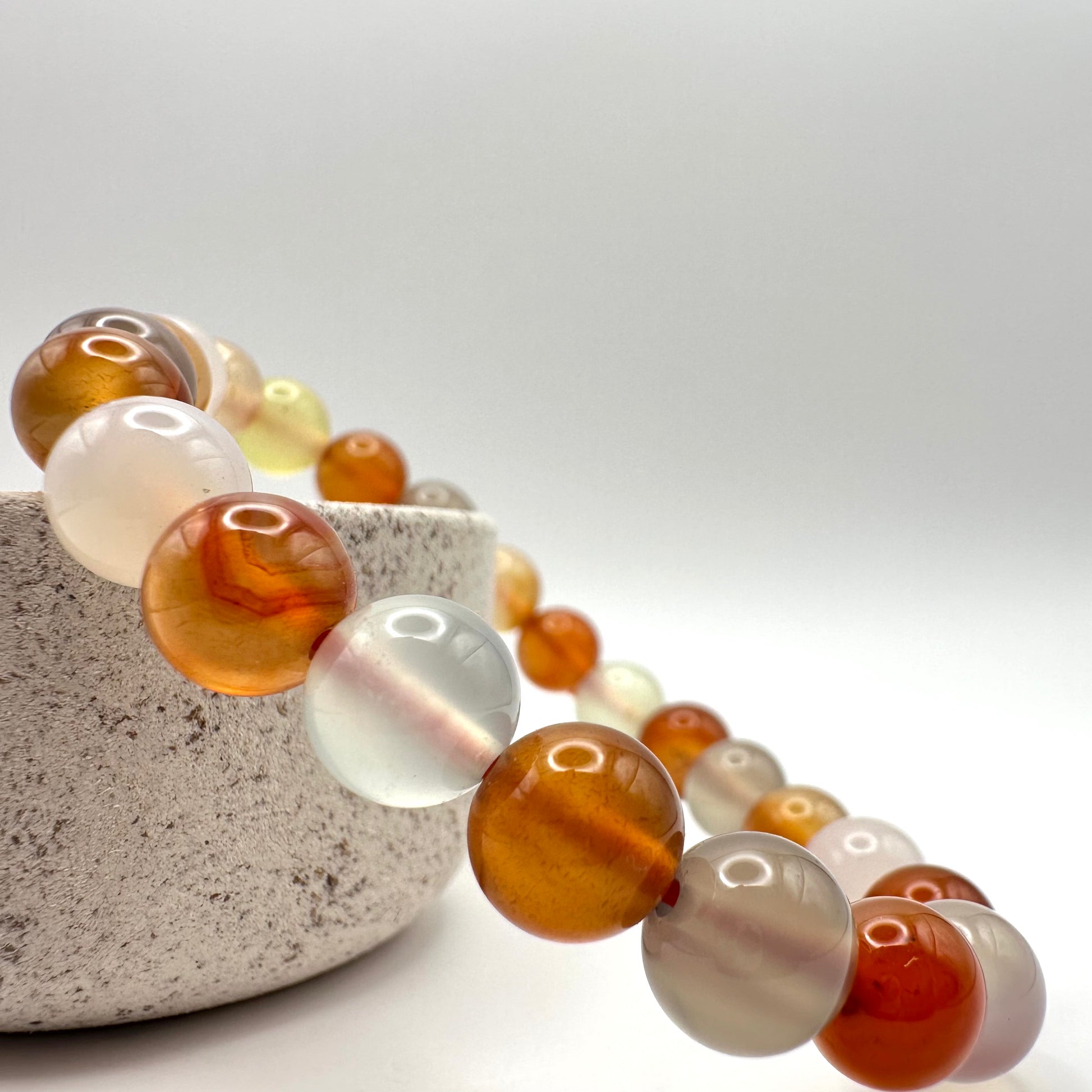 Eigenschaften: Dieses Armband kombiniert die belebende Energie des Karneols mit der erdenden Kraft des grauen Achats. Es hilft dabei, das emotionale Gleichgewicht zu finden, steigert den Optimismus und schützt vor Stress. Dank der Vielfalt an natürlichen Mustern in den Perlen ist jedes Stück ein Unikat.