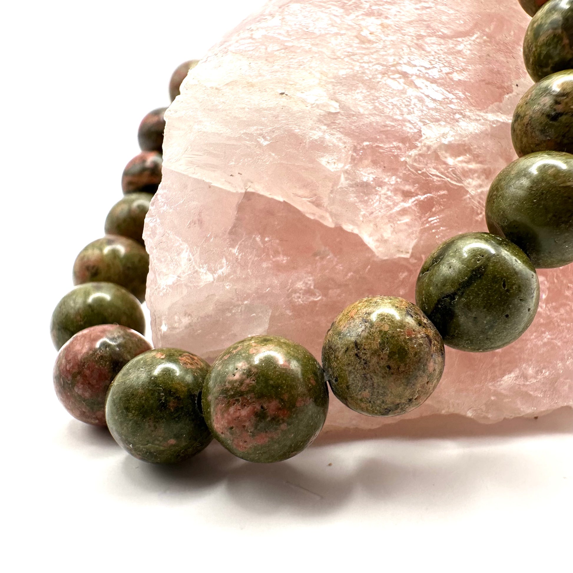 Dieses markante Armband besteht aus polierten, runden Perlen des Steins Unakit. Der Stein zeichnet sich durch seine charakteristische Farbkombination aus: kräftiges Grün (Epidot) mit warmen Rosa- und Orangetönen (Feldspat). Die Größe der Perlen (ca. 8 mm) macht dieses Armband zu einem echten Statement-Piece.