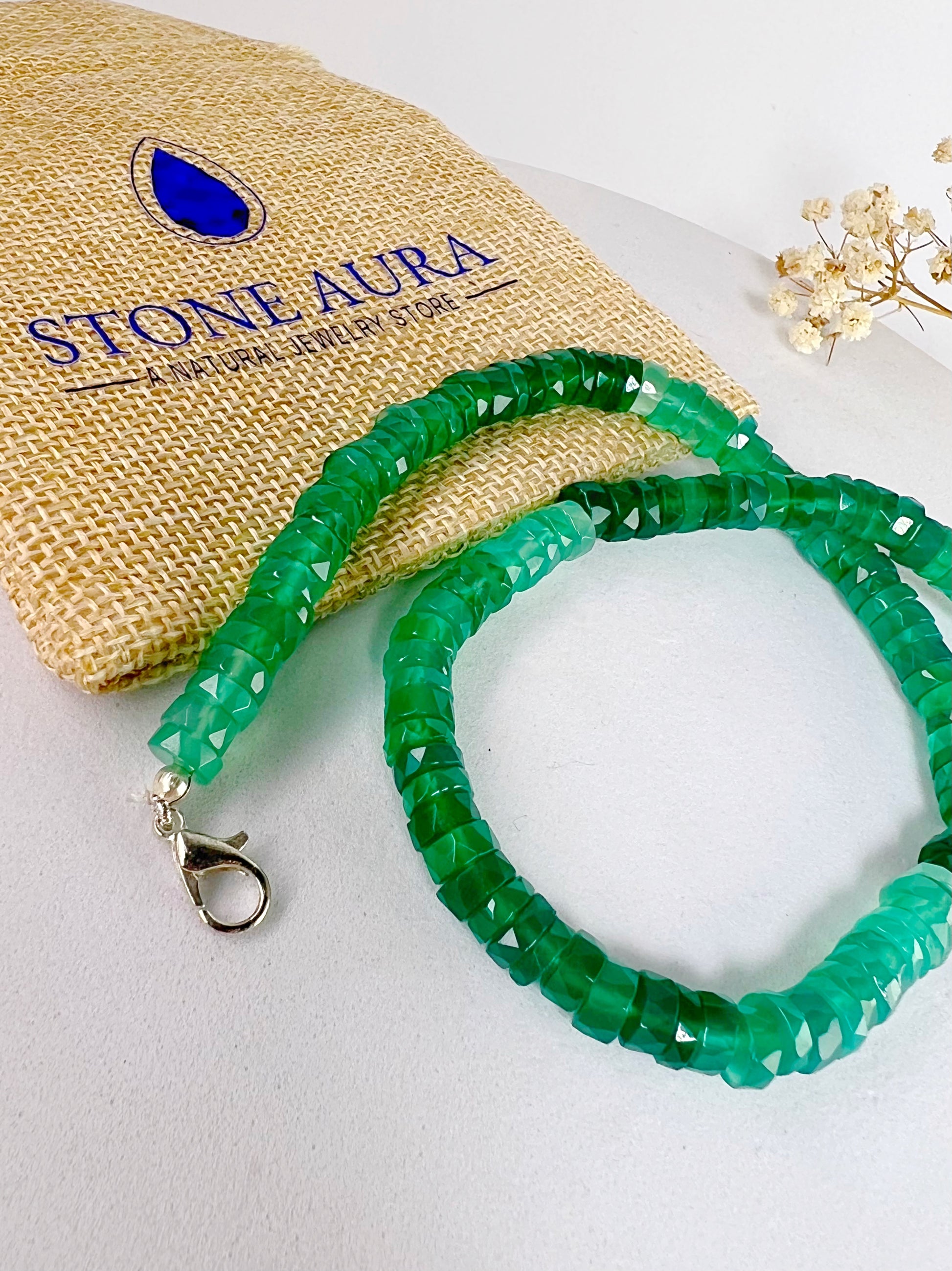 ✔️ Natursteine: Echte, verschiedene Chrysopras-Steine – glatt geschliffen, charakteristische, leuchtende Apfelgrün- bis Mintgrün-Töne mit zarter Transparenz