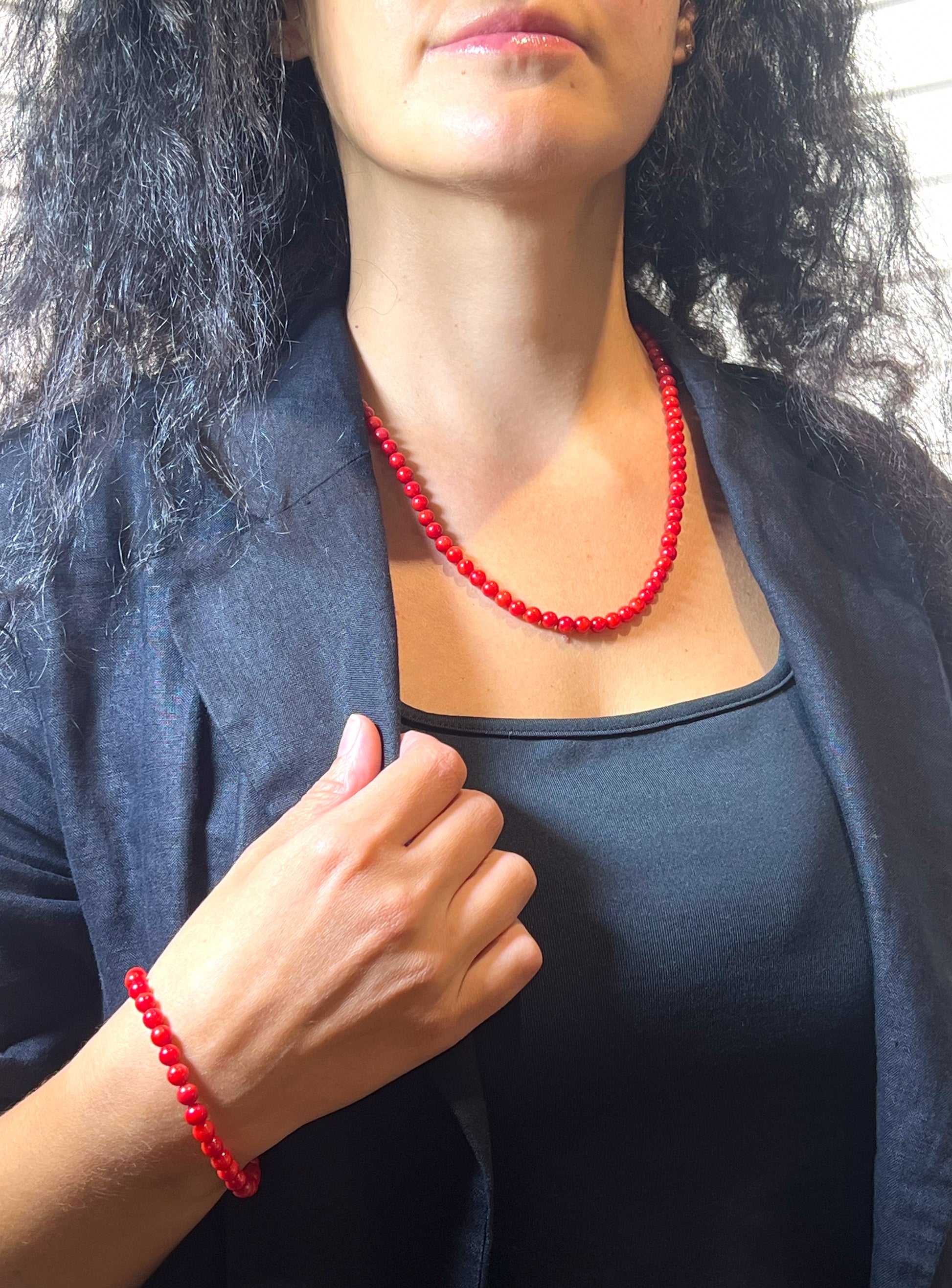 • Armband: Presskoralle, Kugelgröße ca. 7–8 mm, auf hochwertigem Stretchband, Länge verstellbar von ca. 17 cm bis 21 cm