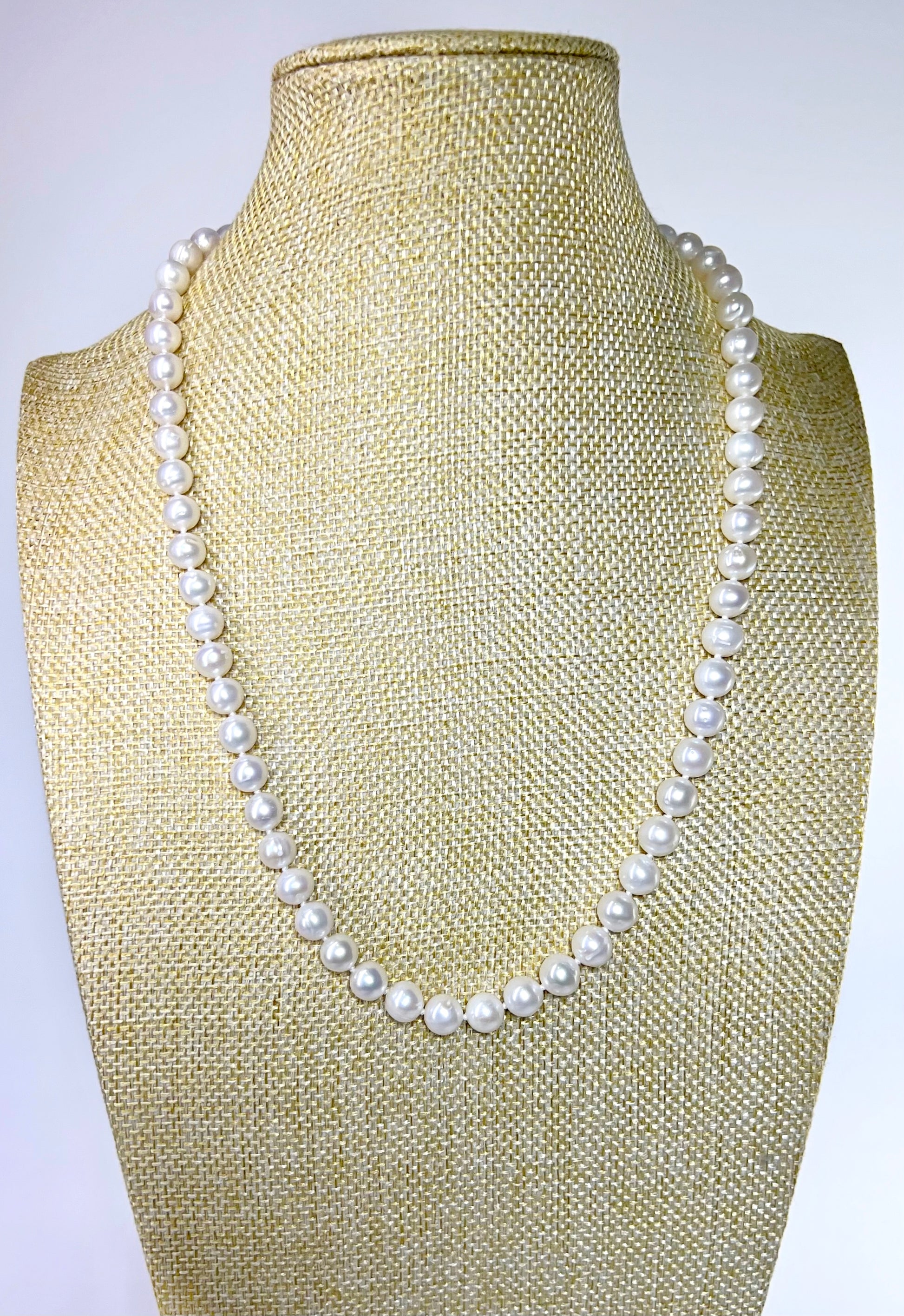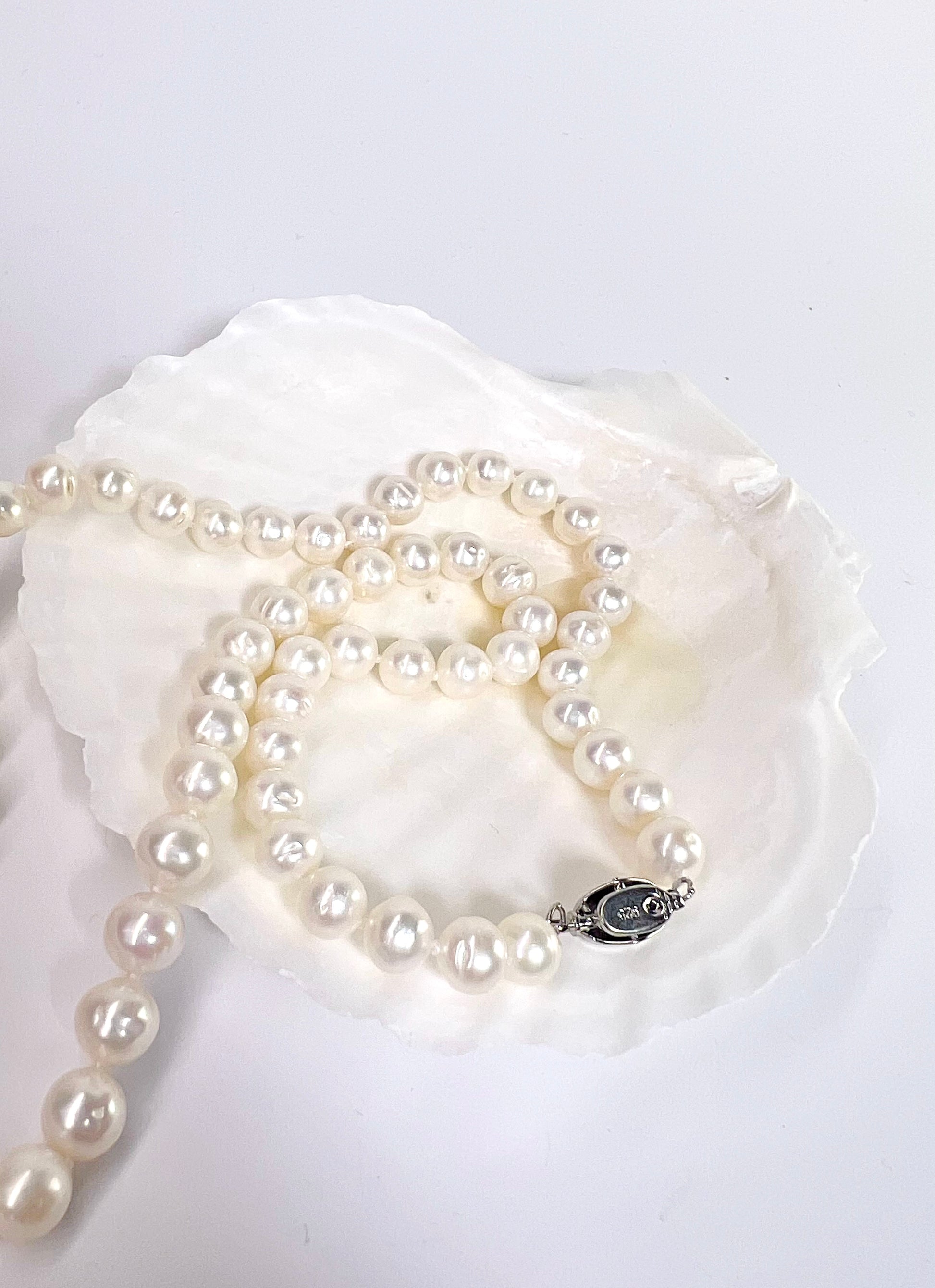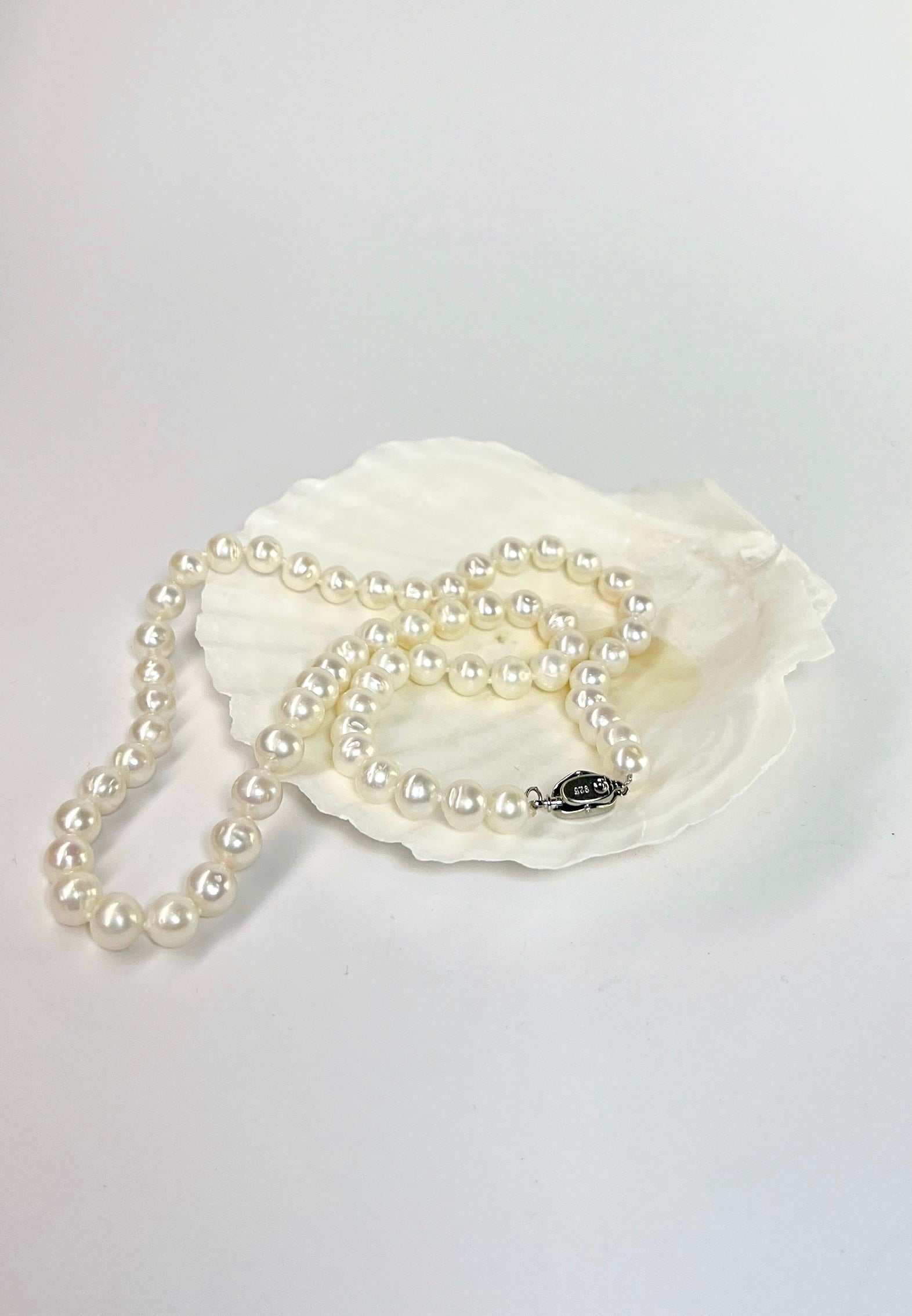 Klassische Perlenkette aus wunderschön schimmernden Süßwasserperlen. Die Länge von 45 cm macht sie zum idealen Schmuckstück für jeden Anlass. Gesichert wird sie durch einen soliden 925er Sterling-Silber Verschluss.