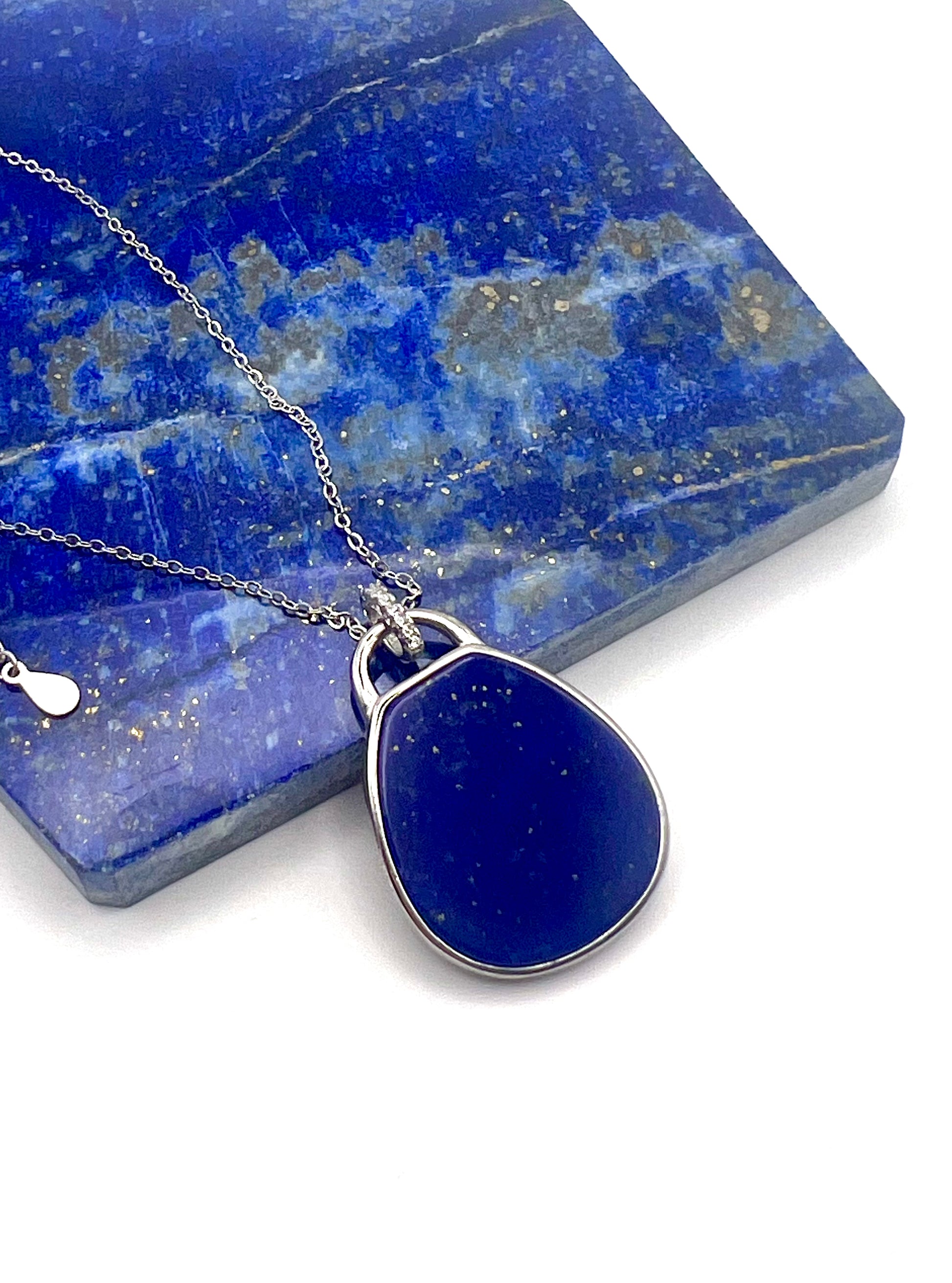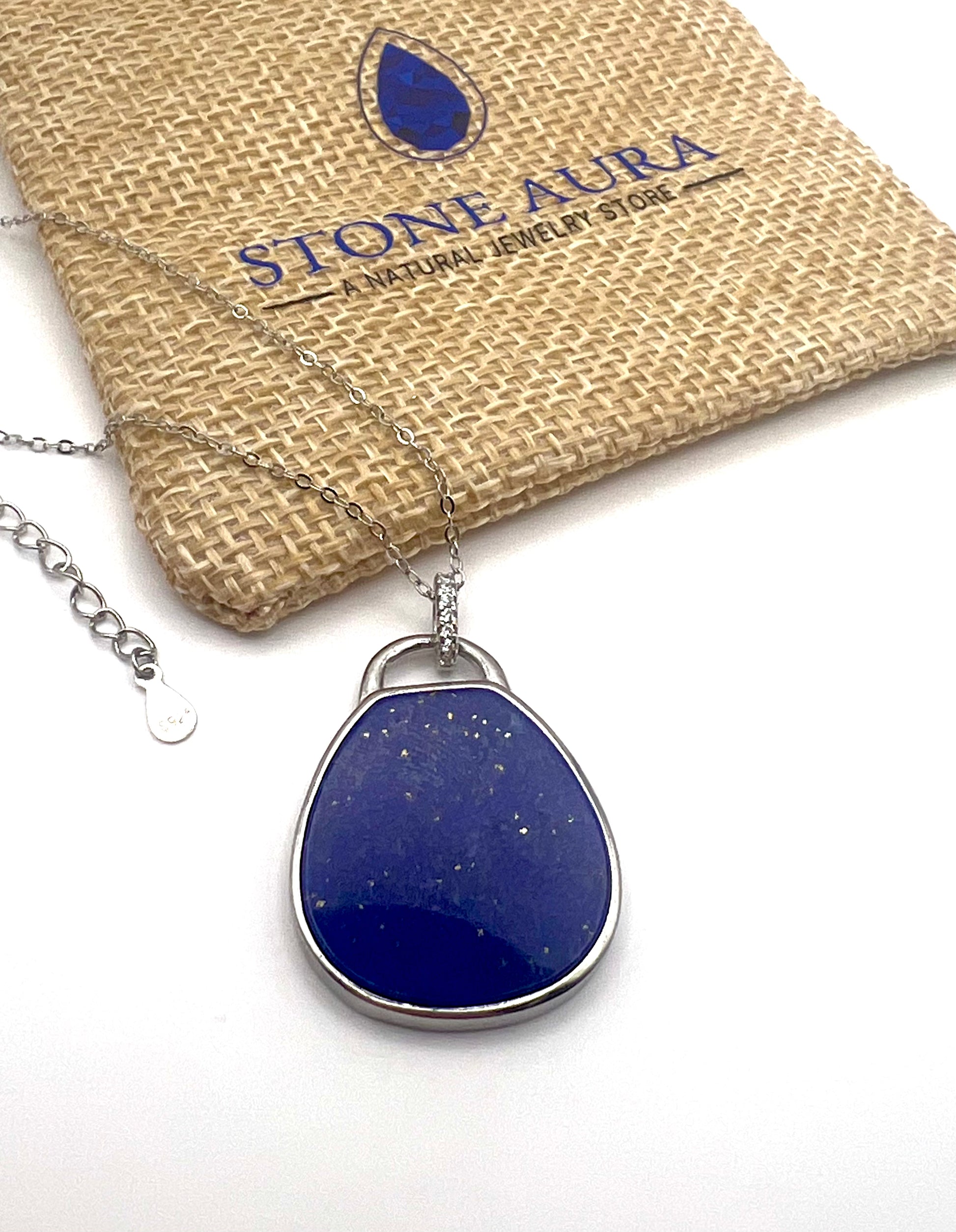 Großer Statement-Anhänger aus glänzendem 925er Silber mit einer Kette. Der asymmetrisch geformte Lapislazuli besticht durch sein intensives Tiefblau und die natürlichen goldenen Pyrit-Punkte (Sternenstaub-Effekt). Der Bügel ist elegant mit funkelnden Zirkonia besetzt. Ein beeindruckendes und zugleich zeitloses Schmuckstück.