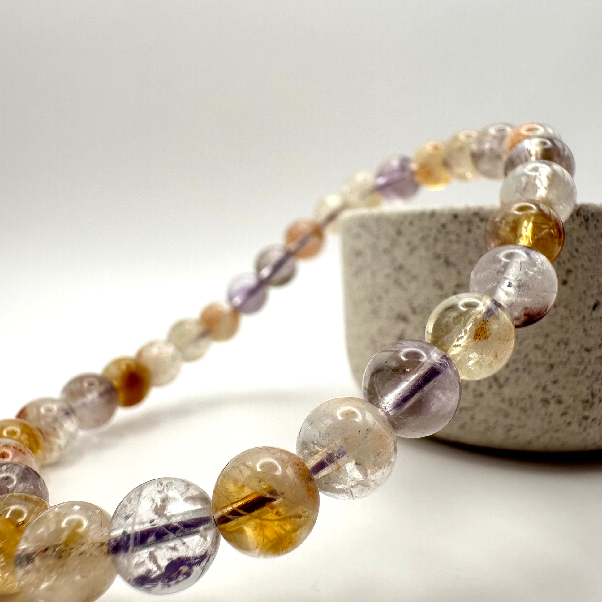 Zusammensetzung: Jede Perle enthält Einschlüsse von Amethyst, Kakoxenit, Goethit, Lepidokrokit, Rutilquarz, Rauchquarz und Bergkristall.